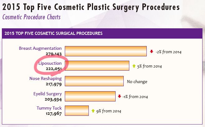 在2015年美國有超過22萬例的抽脂手術(Liposuction),在美容醫學手術僅次於隆乳手術(約27萬例)。